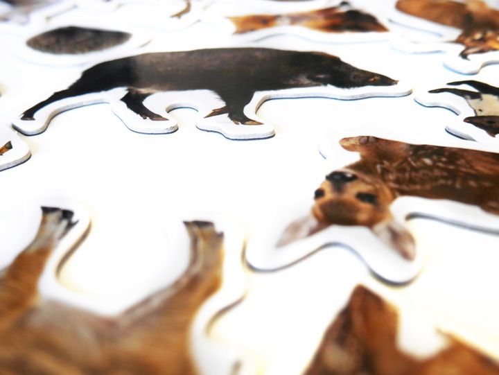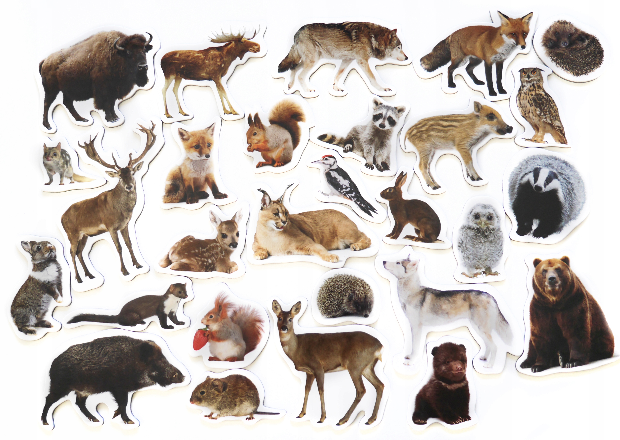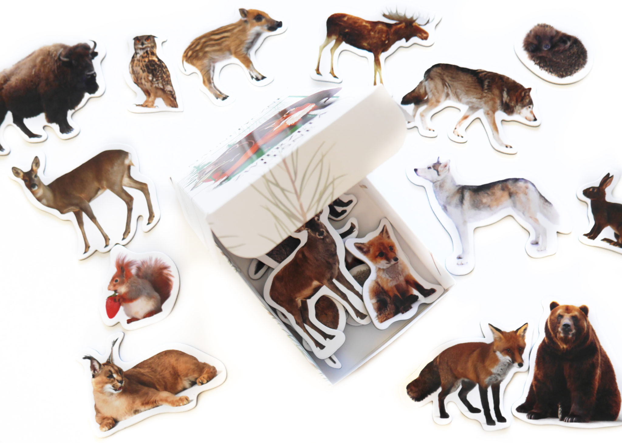 Nauka przez zabawę: Dziecko poznaje mieszkańców polskich lasów – od potężnego żubra i niedźwiedzia, po sprytnego lisa, urocze wiewiórki i rzadkie okazy, jak ryś czy kuna.