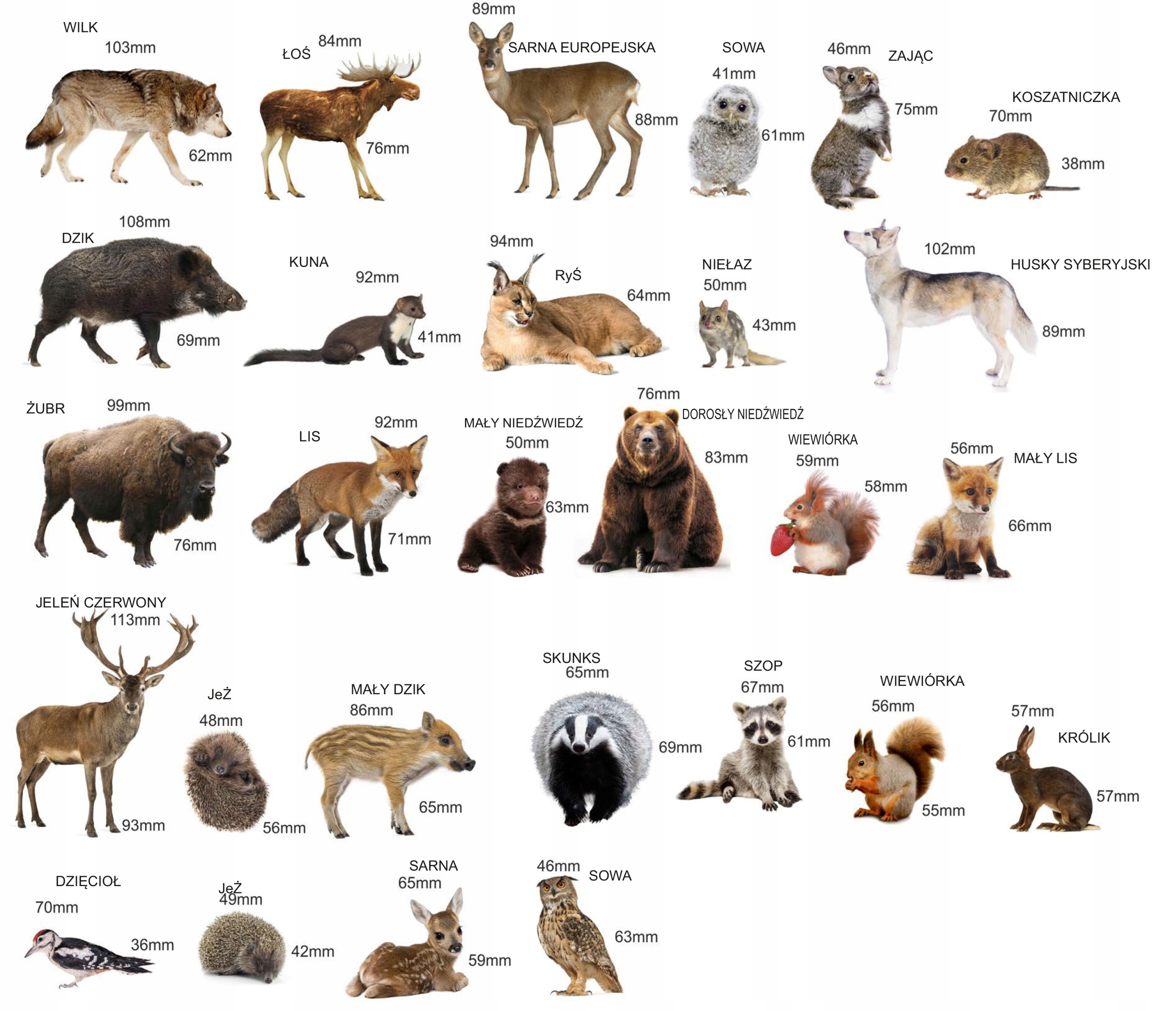 Małe zwierzęta leśne: Wiewiórki (2 rodzaje, w tym z orzeszkiem), Jeże (2 rodzaje), Zając, Królik, Koszatniczka (Mysz leśna).