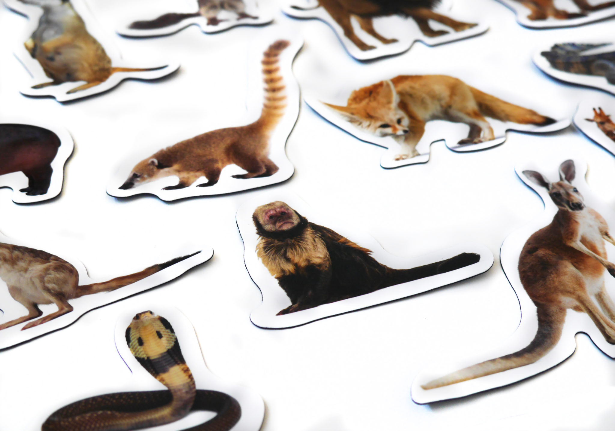 Segregowanie (Kategoryzacja) – Poleć dziecku, aby pogrupowało magnesy: osobno drapieżniki (lew, tygrys), osobno zwierzęta roślinożerne lub pogrupowało je według kolorów.