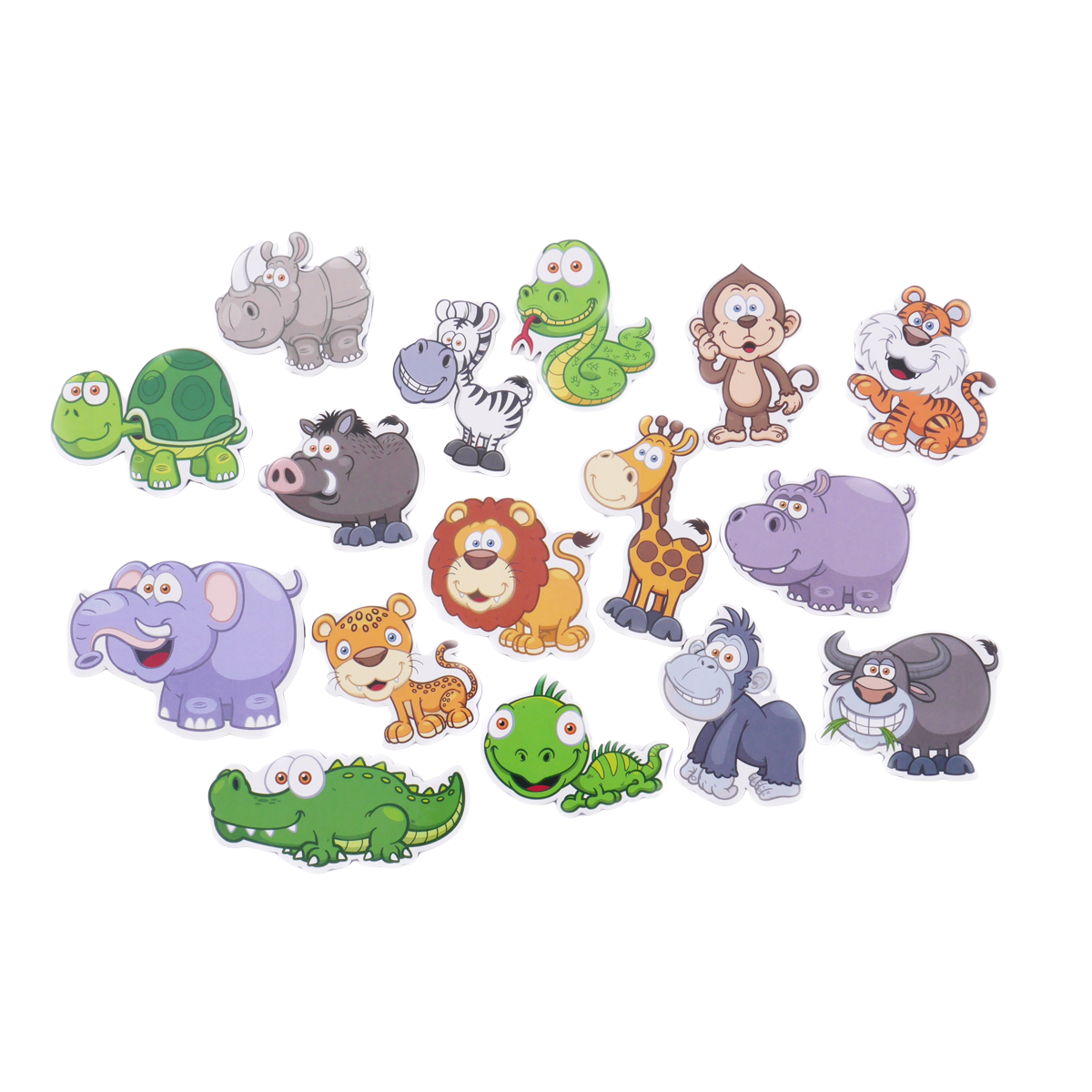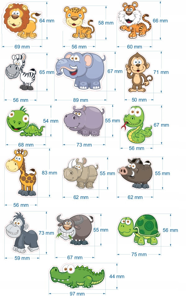 - lew, tygrys, zebra, słoń, hipopotam, małpa, wąż, żyrafa, nosorożec, żółw, krokodyl, goryl, gepard, iguana, guziec, bawół.