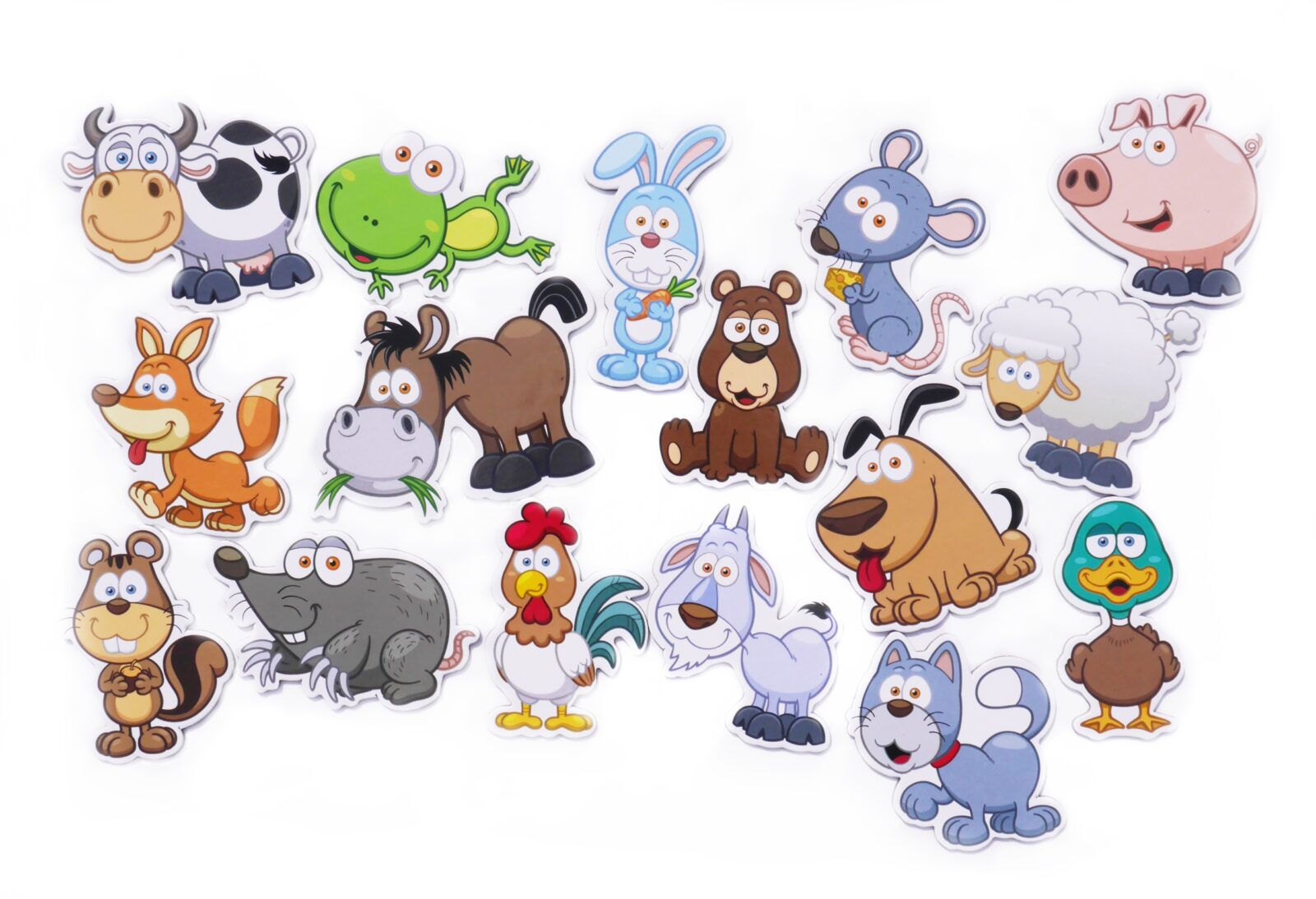 - krowa, żaba, królik, szczur, świnia, owca, pies, kaczka, kot, koza, kogut, kret, wiewiórka, lis, koń, miś