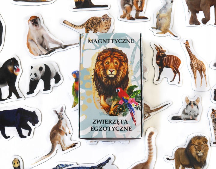 Zestaw Magnesów na Lodówkę „Poznaję Zwierzęta Egzotyczne” – 28 sztuk (Wersja PREMIUM z Tekturą)