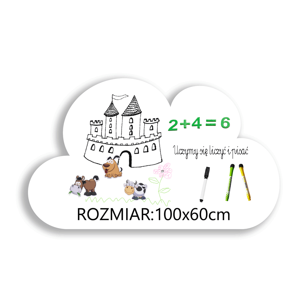 Magnetyczna tablica suchościeralna w kształcie chmurki to funkcjonalny i stylowy dodatek do każdego wnętrza. Doskonale sprawdzi się do pisania, rysowania oraz przypinania notatek i zdjęć, pomagając w organizacji codziennych zadań. Gładka, biała powierzchnia umożliwia łatwe ścieranie bez smug, a duży format 100 × 60 cm zapewnia dużo miejsca na planowanie i kreatywność. Idealna do pokoju dziecka, kuchni, biura lub przestrzeni edukacyjnej – łączy praktyczność z nowoczesnym designem.